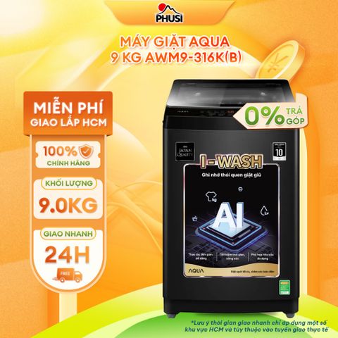 - Máy giặt Aqua 9 kg AWM9-316K(B) được thiết kế tinh giản với tone màu đen chủ đạo hợp thời và tinh tế.