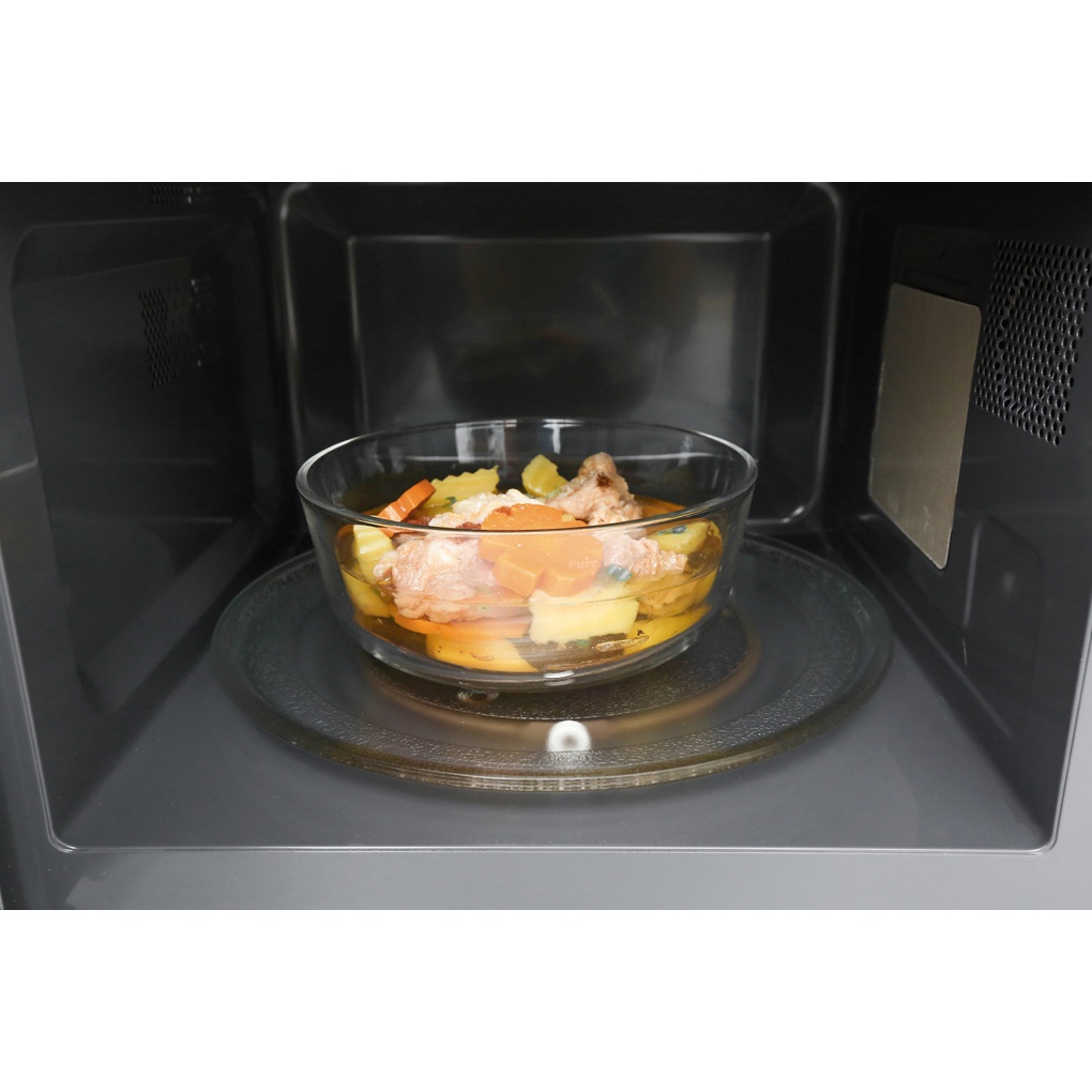- Khoang lò vi sóng bằng thép không gỉ bền bỉ, hạn chế han gỉ, dễ vệ sinh sau khi dùng. Khoang lò rộng rãi có thể hâm được 1 tô canh lớn