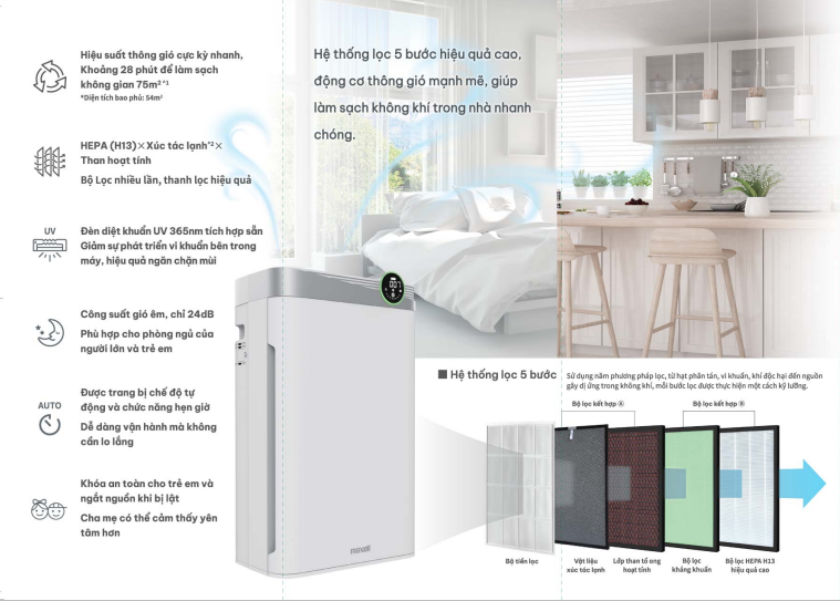 Với độ ồn thấp chỉ 24dB, máy vận hành êm ái, phù hợp sử dụng trong phòng ngủ hay không gian làm việc. Chế độ cảm biến tự động thông minh giúp máy điều chỉnh công suất theo chất lượng không khí thực tế, đảm bảo tiết kiệm điện và duy trì môi trường sống trong lành. Bên cạnh đó, thiết bị còn có khóa an toàn cho trẻ em và thiết kế dễ dàng tháo lắp, tiện lợi cho việc vệ sinh và bảo trì.