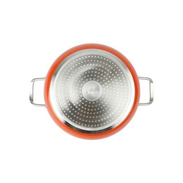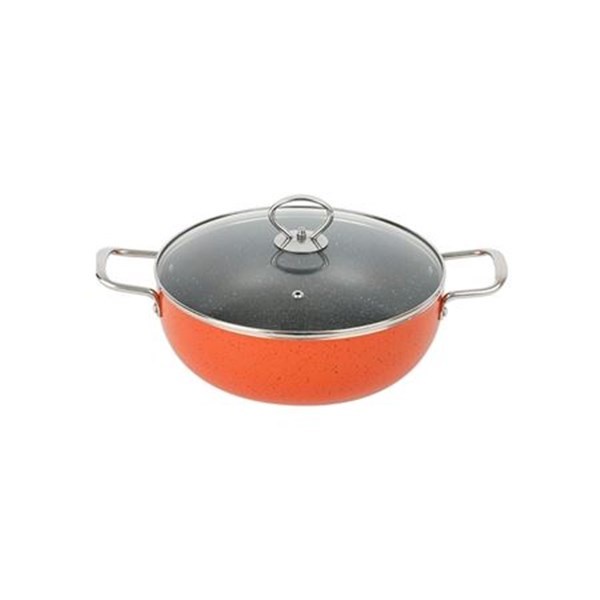- Nồi có màu cam nổi bật kết hợp họa tiết vân đá đen đẹp mắt tạo nên diện mạo hiện đại, tươi trẻ. Đường kính 26cm phổ biến, dễ sử dụng.