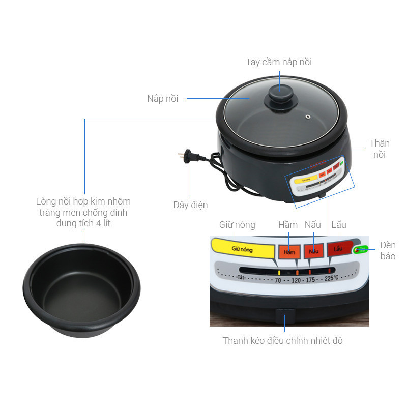 Dễ dàng sử dụng nồi lẩu điện với bảng điều khiển nhiệt độ bằng nút gạt.Ngoài nấu lẩu, nồi còn có thể dùng để chiên xào, nấu canh, hầm hoặc kho thịt cá… đều rất tiện lợi.