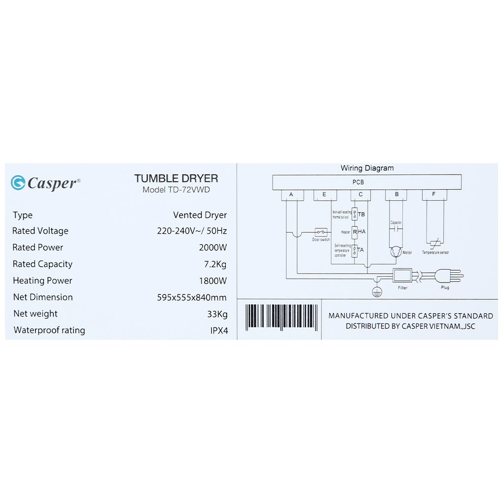Máy sấy quần áo Casper 7.2 kg TD-72VWD sở hữu ngôn ngữ thiết kế tối giản, màu Trắng thanh lịch dễ dàng hòa hợp với mọi kiểu trang trí nội thất. Ngoài ra, máy sấy Casper thế hệ mới này còn được tích hợp hàng loạt công nghệ và tính năng hiện đại như: công nghệ Sấy thông hơi giúp sấy nhanh chóng và tiết kiệm điện; tính năng Chống nhăn giảm rối xoắn và các nếp nhăn; Chế độ Refresh loại bỏ các mùi khó chịu trên quần áo,... Hơn nữa, với 16 chương trình sấy và khả năng sấy lên đến 7.2 kg quần áo, chúng đảm bảo đáp ứng được nhu cầu sử dụng cho các gia đình có khoảng 2 - 3 người.